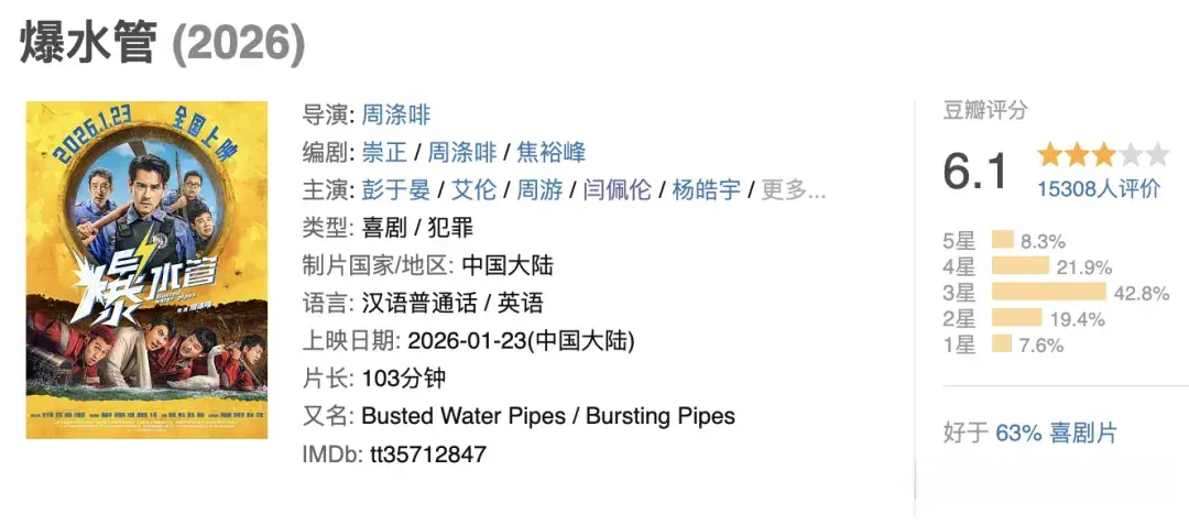 除此之外,《爆水管》的票房后劲也是很足的,虽然口碑一般,但票房走势有点像去年的《浪浪人生》,冲上1亿了,可见,喜剧真的是硬通货啊。